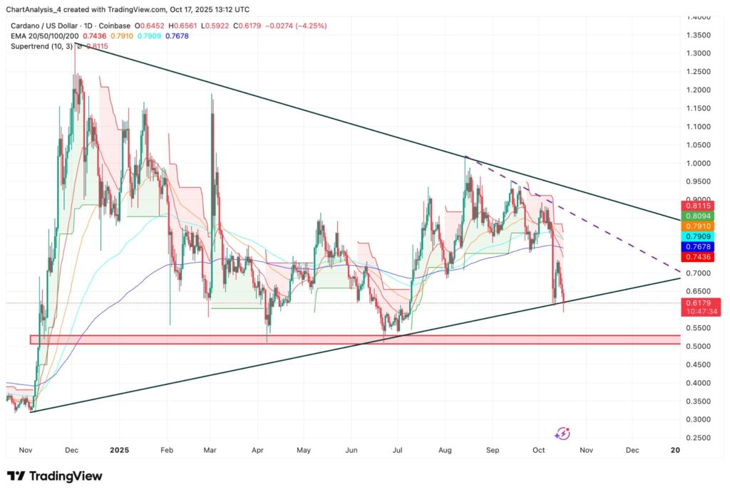 ADA fell to $0.61 after failing to defend its $0.74–$0.79 EMA cluster, breaking below the wedge structure that has guided price action through 2025.