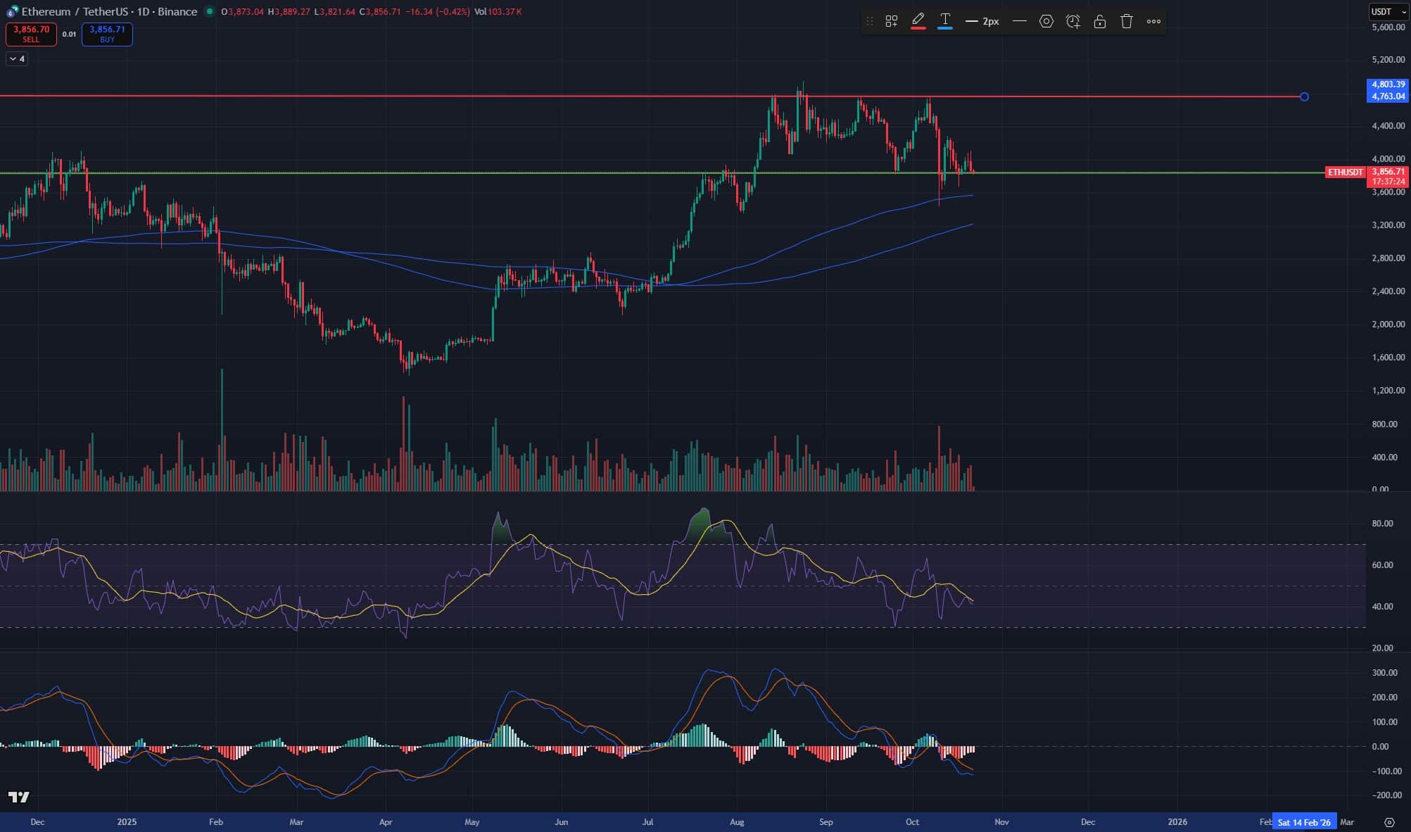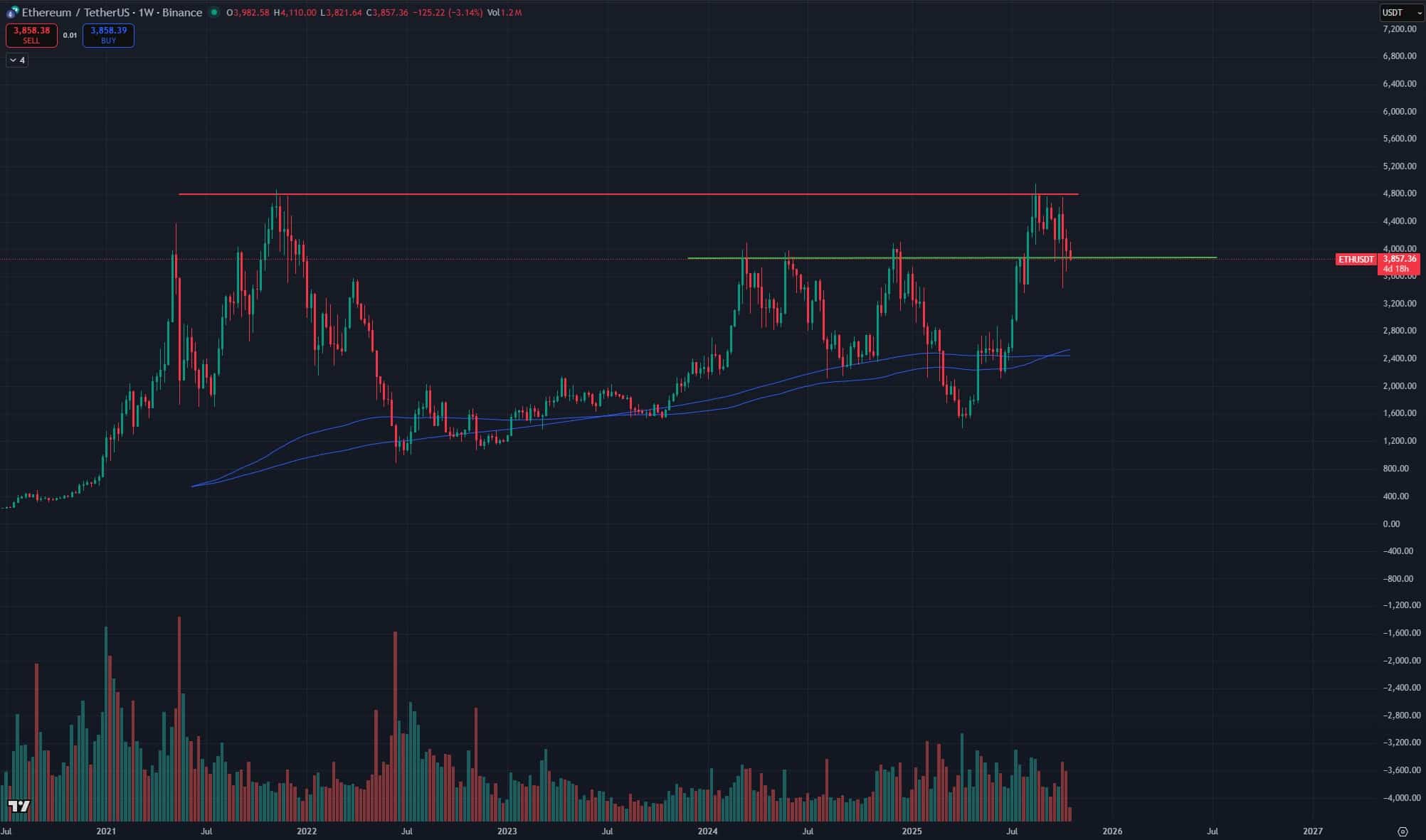 price managed to hit a new ATH at $4950 and is now retracing back to $3860 level. That marks a double top pattern, which can lead to significant profit-taking and cause the ETH price to seek support later on. On a weekly time frame, this support is around $3850 level, where the price has previously tried to break out three times. This makes a perfect spot to bet that the ETH price will go up, given the positive fundamentals and technicals.