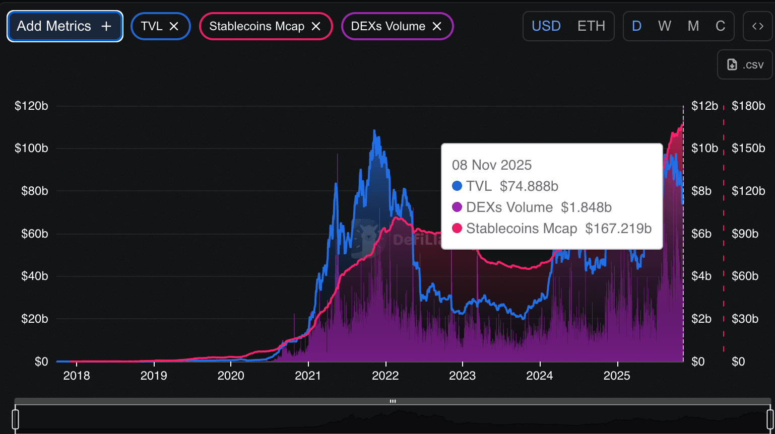 DeFiLlama data shows Ethereum stablecoins at about $167.2Bn. DEX volume over the past day came in near $1.848Bn, with roughly 464,000 active addresses.