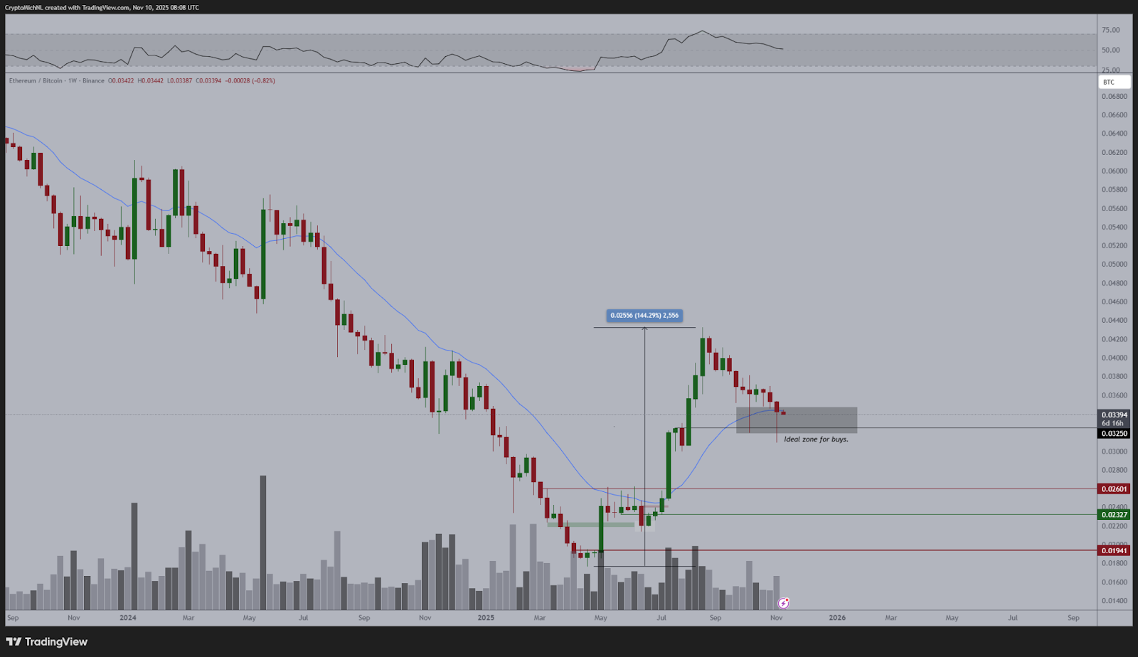 On the charts, Ethereum is sitting near a key weekly support level against Bitcoin, according to analyst Michaël van de Poppe.