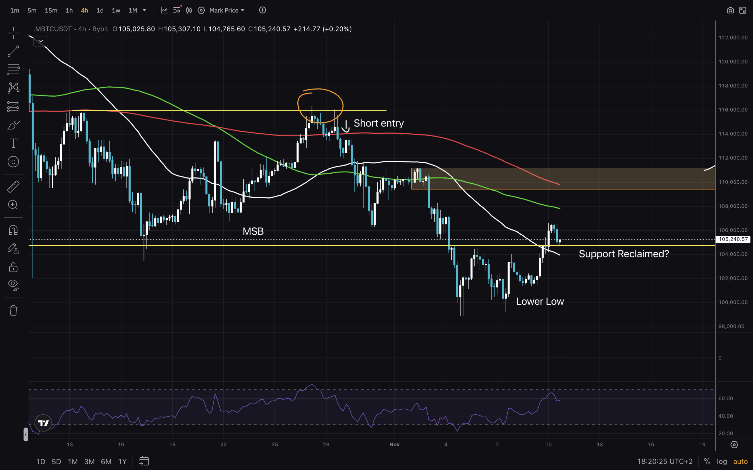 For traders, it is important to know how to trade in both directions of the market. On this 4H chart, we can see a great setup for a short. I marked the high formed after the SFP. Once the $116,000 level was rejected and the price dropped below the MA200 again, that was our trigger. Entry at ~112,500 with a stop at $116,000. Easy 2R until the $105,000 support and a 3R+ trade down to the Lower Low.