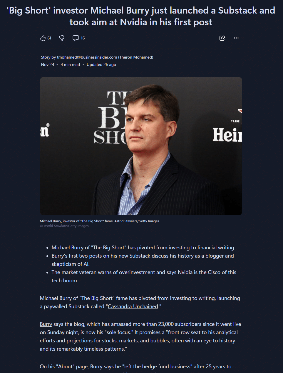 The Substack’s name is a reference to the mythological Cassandra, who was cursed to deliver true prophecies that no one would believe, and signifies Burry’s new freedom to speak more freely about market trends, including his skepticism of the AI boom.