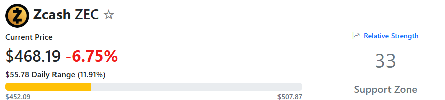 Currently, ZEC trades at roughly $470, representing a solid retreat from the local high above $730 reached earlier this month. Recall that the asset was at the forefront of gains in October and most of November, but the bears seem to have regained control recently.
