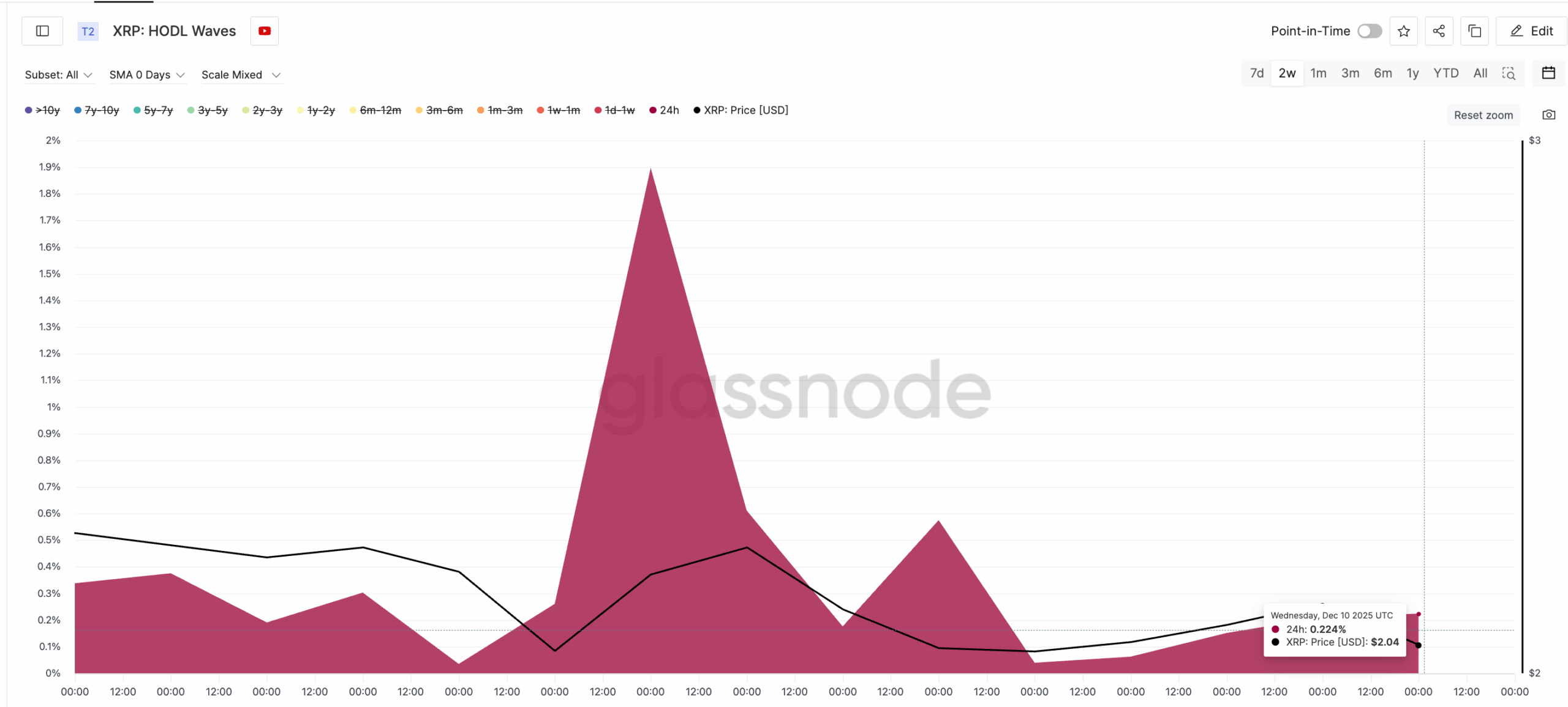 XRP’s short-term holders are now pulling back supply. The shift shows up clearly in the HODL waves metric, which tracks how much of the circulating supply each age group controls. The 24-hour cohort held 1.89% of the supply on December 2.