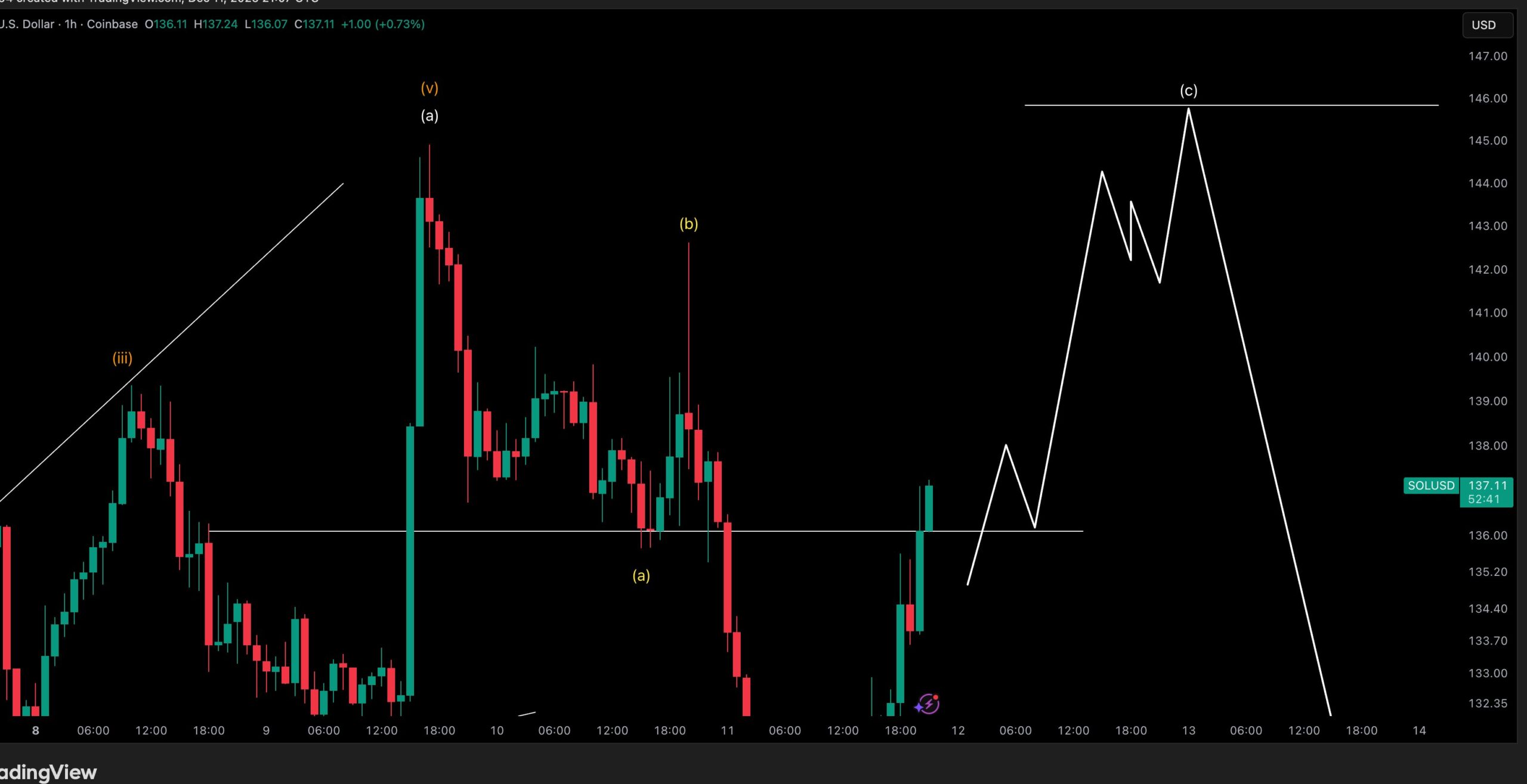Price has bounced from support around $135, hinting that buyers may be stepping back in. The projection also shows a possible climb toward $146, labelled as wave “(c).” That level now stands out as the main resistance zone traders are watching.