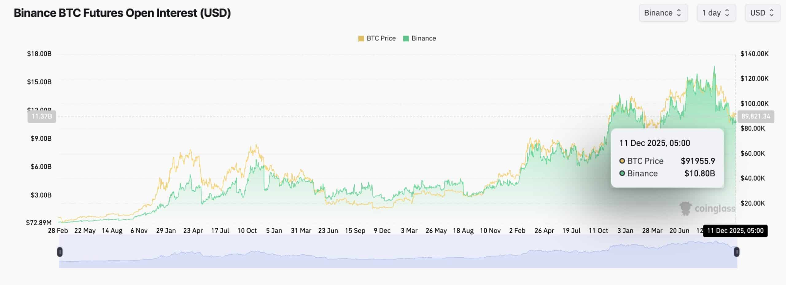 CoinGlass puts Bitcoin’s Binance futures open interest near $10.80Bn. That’s only a small lift from the day before, which shows traders are steady and not chasing risk ahead of the next big macro event.